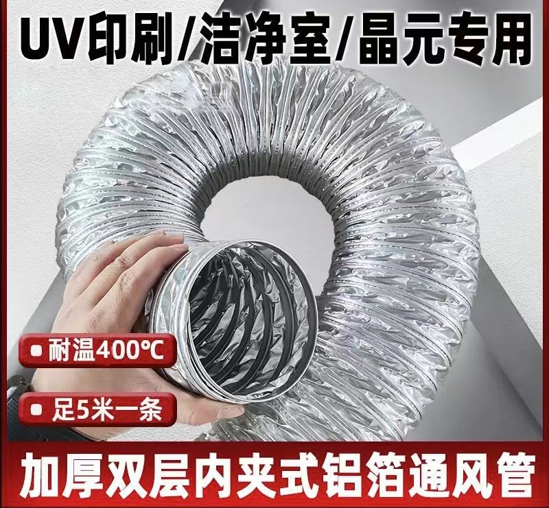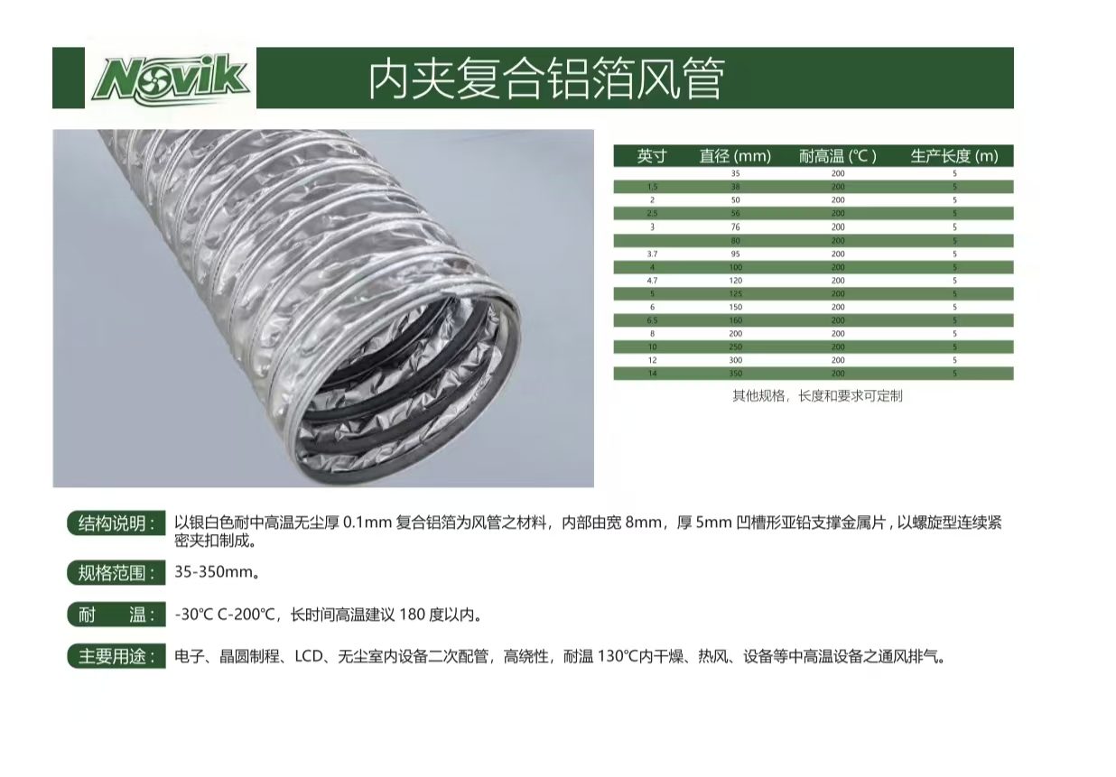 Structural Description: The ductwork is made of 0.1mm thick, silver-white, high-temperature resistant, dust-free composite aluminum foil. Internally, it consists of 8mm wide and 5mm thick grooved zinc-containing support sheets, secured with a continuous, tightly clamped spiral design.