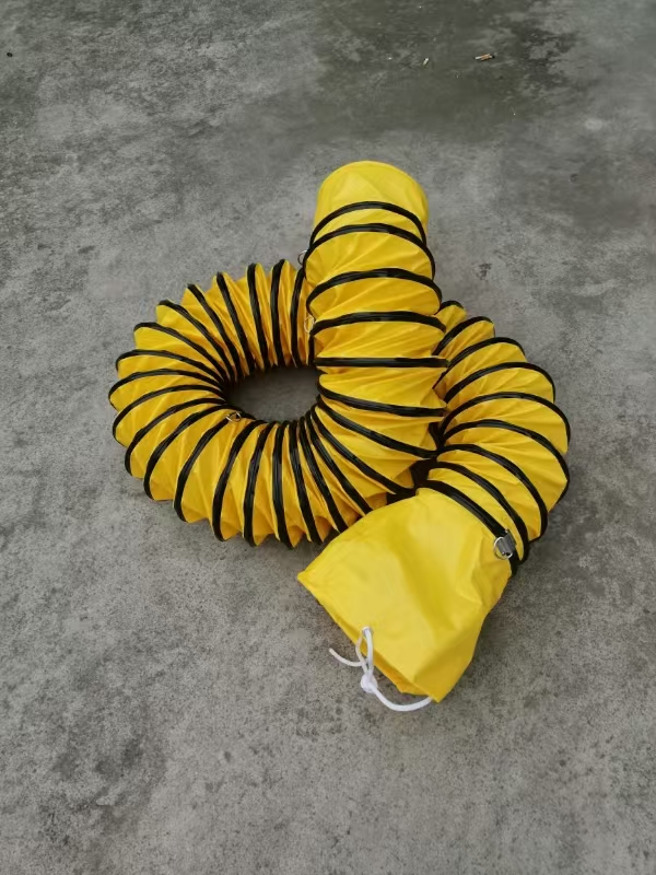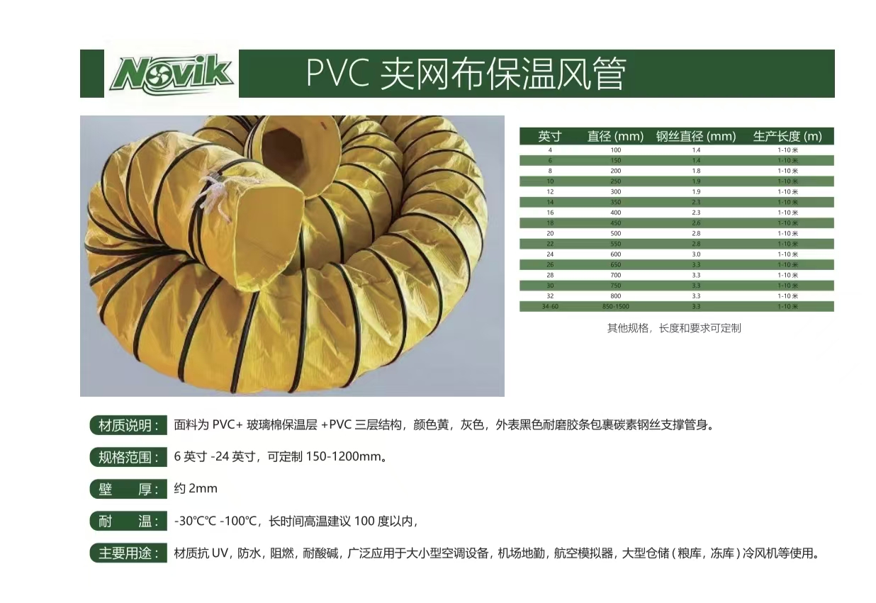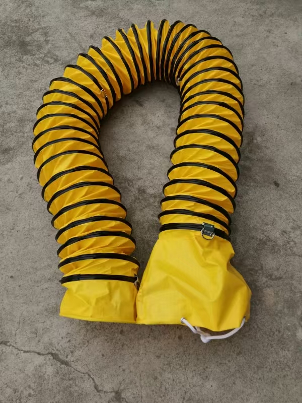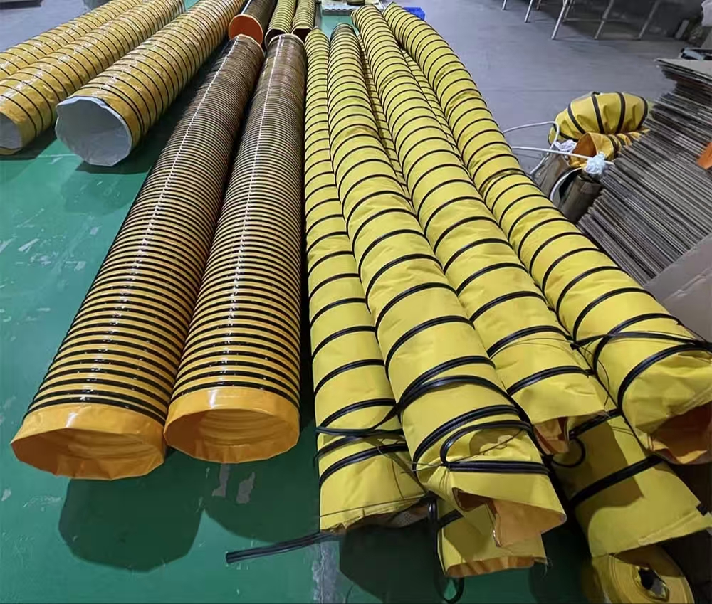 Structural Description: The outer fabric is a three-layer structure consisting of PVC, glass wool insulation, and another PVC layer. Colors include yellow and gray, with a black wear-resistant rubber strip wrapping the carbon steel wire support tube.